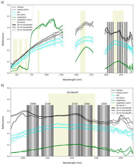 Example spectra for crop residue (NPV), soil, and green vegetation as surface reflectance and as surface reflectance with addition of simulated sensor noise and atmospheric correction residuals (atm) for (a) 400–2500 nm wavelength range, and (b) 1950–2450 nm wavelength range for the same spectra, showing the five shortwave infrared (SWIR) bands under consideration at 10, 30, and 50 nm bandwidths (grey bars) as well as current Landsat Operational Land Imager (OLI) bands (tan bars). Note the decreased crop residue reflectance at 2100 nm and 2300 nm due to ligno-cellulose absorption, with bordering reflectance maxima at 2000 nm and 2210 nm. The five narrow SWIR bands under consideration capture these differences in spectral reflectance, which are otherwise convolved into a single Landsat 8 OLI Band 7.