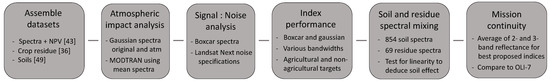 Workflow, including data compilation, atmospheric and signal-to-noise assessment, evaluation of index performance, background soil effects, and determination of mission continuity for proposed bandwidths and band centers associated with the top-performing indices.
