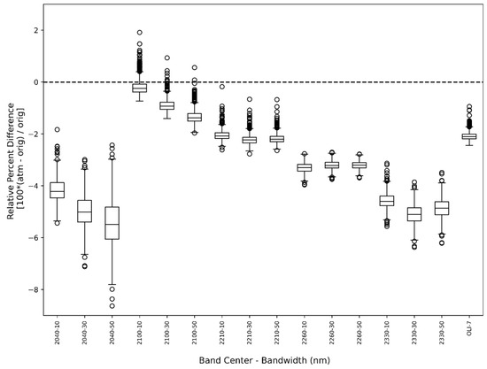 Relative percent difference of reflectance between original (org) and atm spectra, indicating residual atmospheric interference for five SWIR bands, at bandwidths of 10, 30, and 50 nm, as well as OLI Band 7, at 180 nm bandwidth. The x axis indicates band center wavelength followed by bandwidth (nm). The generally negative RPD values are unique to the correction scheme in [43]. The relative differences between bands provides a performance metric of robustness to atmospheric constituents with 2040 nm band being notably impacted by CO2 absorption.