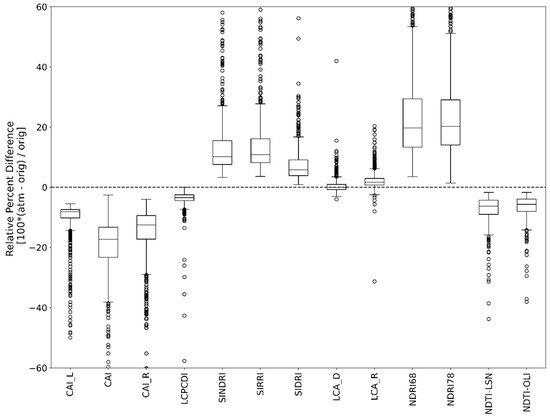 The effect of atmospheric residuals on band reflectance (0.2 to ~5.6% mean RPD) were magnified during the calculation of SWIR NPV indices (~1% to ~20% mean RPD; Figure 4). The differences caused by atmospheric impacts on SWIR bands may manifest in negative errors (e.g., CAI) or positive errors (e.g., SINDRI) depending on relative spectral differences of atmospheric effects on different spectral bands. While most NPV indices exhibited relatively modest ranges of errors between +/−0% to 30%, the CAI, NDRI68 and NDRI78 indices showed median RPD well exceeding 15%. NDTI-LSN and NDTI-OLI showed very similar performance despite being computed with different bandwidths.