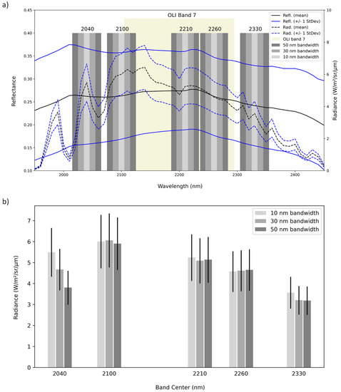 (a) MODTRAN input mean surface reflectance spectra (Refl., solid lines) and output mean at-sensor radiance spectra (Rad., dashed lines), plotted with the five considered Landsat Next bands at various bandwidths. (b) MODTRAN mean at-sensor radiance spectra averaged by bandwidths of 10, 30, or 50 nm for the considered Landsat Next bands. The 2040 nm band is increasingly impacted by atmospheric CO2 absorption at wider bandwidths.