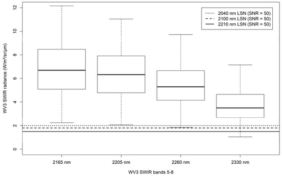 Observed WorldView-3 (WV3) shortwave infrared (SWIR) radiance under springtime conditions (boxplots) compared to simulated minimum radiance needed to achieve sensor signal-to-noise ratio (SNR) > 50 for Landsat Next (LSN) proposed bands at 2040 nm, 2100 nm, and 2210 nm (horizontal lines). SNR calculations for the ~2330 nm band were not included in Landsat Next radiometric simulations.