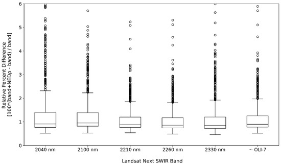 Noise-equivalent delta reflectance (NEDρ) values were obtained using the LSN SNR scaled to the measured radiance of the residue samples (Figure 6). Since the residue samples had higher radiance values than the LSN minimum radiance levels (SNR = 50), actual SNR for the samples was generally ~90–100. For all five SWIR bands the NEDρ RPD (Figure 7) terms were less than +/−1% (0.91, 0.95, 0.88, 0.86, and 0.85% for the 2040, 2100, 2210, 2260, and 2330 bands, respectively, and 0.90% for ~OLI-7). Although NEDρ RPD differences were not large, relative performance as indicated by an RPD closest to zero was: 2330 < 2260 < 2210 < OLI-7 < 2040 < 2100 nm.