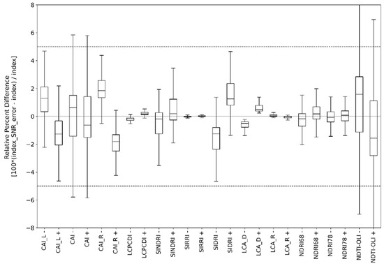 When SNR uncertainties (NEDρ values) were propagated into the generation of SWIR NPV indices, mean RPD varied within a range of +/−5.5% (Figure 8). Relative index performance as indicated by RPD closest to zero was: SIRRI < LCA-R < NDRI78 < LCPCDI < NDRI68 < SINDRI < LCA-D < CAI < SIDRI < CAI_L < NDTI-OLI < CAI_R. Overall, these findings suggest that SNR-related uncertainties do not have a large impact on spectral band radiometric properties nor on derived NPV indices. Overall, the band-specific SNR related impacts (Figure 8) are considerably less than the impacts of residual atmospheric artifacts and sensor noise (Figure 4). We conclude that projected SNR properties do not have a substantial impact on the ability of Landsat Next to accurately characterize NPV and crop residue.