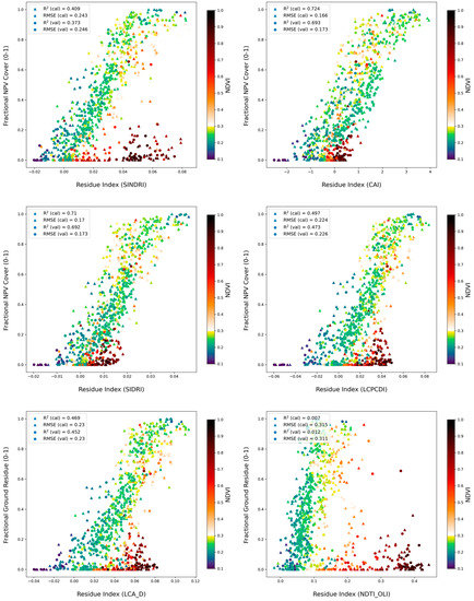 In addition to the 916 spectra dataset of agricultural targets, NPV assessment was conducted on 808 gaussian spectra collected from non-agricultural areas that were gleaned from Dennison et al. [19], with results included in the data release accompanying this manuscript [44]. The dataset included 129 spectra from California grassland, 60 spectra from Brazilian grassland, 595 spectra of California shrubs, and 24 spectra of poplar shrubs. Overall, results were similar to those for agricultural targets, with somewhat lower R2 (maximum R2 of 0.71 for NDVI < 0.3 and 0.51 for NDVI < 1.0) and higher RMSE (minimum RMSE of 0.06 for NDVI < 0.3 and 0.16 for NDVI < 1.0), and a somewhat different comparative performance of the various indices, with NDRI68 index emerging as a strong performer and CAI performing poorly in the non-agricultural dataset with NDVI < 0.3 (n = 45) [44].