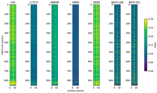 Soil composition and minerology affect reflectance from the soil fractional component, in the SWIR as well as the visible-NIR wavelengths [14,35]. To assess response of SWIR NPV indices to various background soil types, the Brown et al., (2006) [49] soil reflectance dataset was used to perform a simulated linear spectral mixing of each soil type with NPV reflectance spectra from crop residue (Serbin, 2009 [14]) at calculated levels of 0, 15, 30, 60, and 100% NPV (no green vegetation fraction was present, therefore % NPV + % soil cover = 100). After performing this mixing, the various SWIR NPV indices were calculated and were correlated with fractional NPV. Ideally each SWIR NPV index would yield an R-value of 1.0 for each simulated NPV-soil pair, indicating that the index is responding linearly to fractional NPV and not to reflectance features of the background soil. Additionally, slopes should be consistent between different NPV-soil spectra pairs for a given index, demonstrating efficacy across different soil types. To present a clear illustration of patterns in both R-value and slope (Figure 10 and Figure 11, respectively), the soil spectra number (y-axis) was ordered by median NTDI R-value computed across NPV residue spectra (x-axis). This ordering was applied across indices for both R-value and slope comparison figures for various NPV indices.