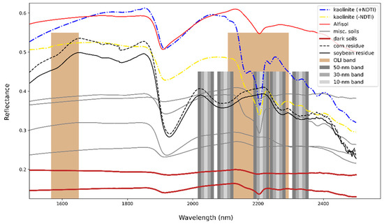 Spectral separation of the NPV and soil components of agricultural land cover is more challenging because NPV and soil show broad spectral similarity with few distinguishing features at visible-NIR (VNIR) wavelengths [9,14]. Separation of the two components using VNIR wavelengths can sometimes be achieved by detecting spectrally broad differences in VNIR brightness, particularly when crop residues are fresh (visibly bright) and soils are visibly dark, but these measures are highly dependent on soil moisture content and the age and decomposition state of crop residue, resulting in a low degree of accuracy when these conditions are unknown [15,16].