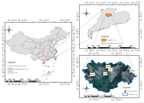 The study area included five cooperative tea gardens Degaoxin, 800xiucai, Chuangmei, Jiqingli, and Shimenshan, in Yingde City, Qingyuan, Guangdong Province, China. Yingde City (23°50′31″–24°33′11″N, 112°45′15″–113°55′38″E) has a land area of 5634 km2 [] and is located in the transitional area from the south subtropical to the mid-subtropical zone. It has a subtropical monsoon climate, with long summers and short winters, sufficient sunshine, abundant rainfall, and an annual average temperature of 20.9 °C []. The geographical location of the study area is shown in Figure 1.