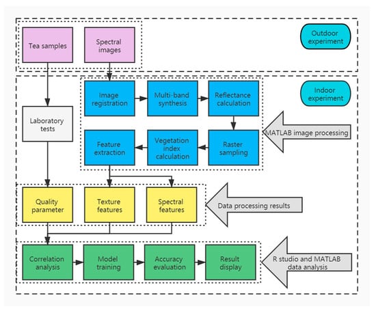 For the acquired spectral images, multi-band image registration, synthesis, reflectivity calculation, raster sampling, vegetation index calculation, and texture features extraction operations were performed in sequence. Correlation analysis and model training were performed on the obtained texture features and spectral features with laboratory test data, and, finally, the accuracy of the model was evaluated. The abovementioned data processing was implemented using MATLAB 2016b software, and the results were displayed using R studio software. The experimental steps are shown in Figure 2.