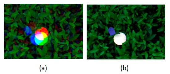 Tea canopy images were radiometrically calibrated with standard whiteboard digital numbers and digital number maps were converted to standard reflectance images to improve data quality. The sensor of each channel of the multispectral camera was distributed in an array, and the acquired images of each channel were spatially deviated; however, the cameras were not equipped with an automatic registration program. To facilitate band fusion and spectral information sampling, the Sift algorithm was used [], and the features of each band image were automatically selected, matched, and finally, the bands were fused. An example of true color combination of the RGB three-channel combined image before and after registration is shown in Figure 4.