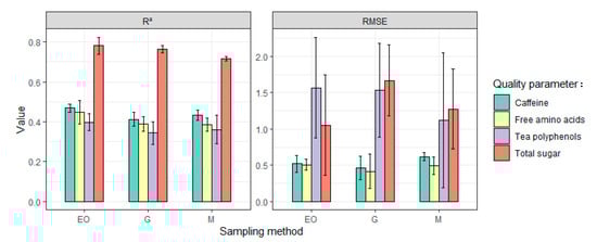 Accuracy (in terms of R2 and RMSE) of the numerical models for different sampling methods. EO = EXG_Ostu, G = global, and M = manual. The error bar represents the standard error and RMSE is the unit (%).