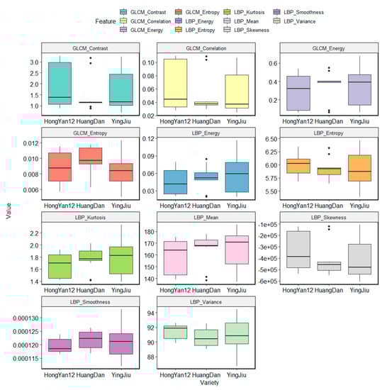 Tea samples of more than 10 varieties were used in this study. Among these, Yinghong No. 9, Huangdan, and Hongyan No. 12 were the main varieties. The texture features of these three varieties were extracted using the texture information extraction method. The consequent results are shown in Figure 9. The descriptive statistics of texture information extracted by different varieties were evidently different. Particularly, the LBP texture features were more different than those of GLCM. This shows that texture features can help distinguish tea varieties, thereby promoting tea quality monitoring.