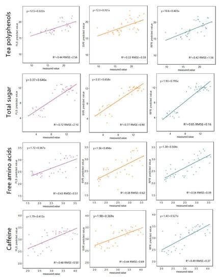 The EO method was used for sampling, and the predicted values of the tea quality parameters calculated using the three models trained by the PLS, SVR, and RFR algorithms were compared with the measured values. The results are shown in Figure 10. Different best-fit model training methods were observed for predicting the results of various tea quality parameters. The PLS and SVR algorithms were the best fits for tea polyphenol prediction and least error, respectively. RFR was the best fit for the total sugar prediction model and had the smallest error. RFR was also the best fit for the free amino acid prediction model and had the smallest error. Additionally, RFR was the best fit for the caffeine prediction model and had the smallest error. Thus, RFR was the best fitted modeling algorithm for three of the four quality parameters. Based on the comprehensive goodness of fit and error factors of tea polyphenols, the best fitted modeling algorithm was RFR.