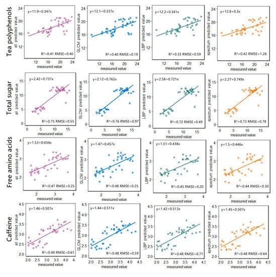 The EO and M sampling methods can destroy the texture information of the original image; additionally, a standard whiteboard in the center of the image should be eliminated; therefore, we used the G sampling method and selected the 1/9 image scale in the upper right corner of the original image. While using this method, background objects, such as soil, should be absent in the selected image. The modeling method selected the best RFR, the accuracies of which before and after adding the texture features are shown in Figure 11. After the integration of the tea polyphenol prediction model with texture features of LBP and GLCM, the result errors reduced, but the goodness of fit of the model did not improve. Conversely, after the prediction model of total sugar was integrated with GLCM texture features, the goodness of fit improved and the result errors increased. The LBP texture features did not improve the model goodness of fit and reduced the prediction result errors, whereas the goodness of fit and the prediction result errors of the model integrated with texture features of both GLCM and LBP improved. The prediction model of free amino acids integrated with texture features improved the goodness of fit and the accuracy of prediction results. The goodness of fit of the caffeine prediction model did not significantly improve after the integration of texture features, but GLCM texture features reduced the prediction result errors. Overall, the tea quality parameter monitoring model that integrated texture features showed higher prediction accuracy, with GLCM contributing more to improving the model accuracy than LBP.