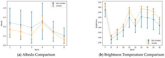 The statistical mean of smoke pixels and non-smoke pixels in shortwave albedo (a) and longwave brightness temperature (b). The X stick represents the bands in AHI. The units of bands 7–16 are K. The orange dots represent smoke pixels and blue dots represent non-smoke pixels. The error bar represents the standard deviation.