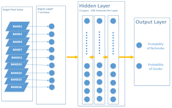 We analyzed the spectral features of the smoke and non-smoke pixels based on marks in all the images in the data set, as shown in Figure 2. After comparing the differences in the mean and variance in the two curves and considering the correlation between long wavebands, we only chose bands 1, 2, 3, 7, 11, 13, 14, 15 and 16 as the input data of our MLP. We used the visible bands (bands 1, 2 and 3) and infrared bands (bands 7, 11, 13, 14, 15 and 16) because most of the objects are distinguished by visible bands and bands 5, 7, 11, 13, 14, 15 and 16 estimate cloud properties [14]. According to Figure 2, band 7 was selected since the difference between smoke pixels and non-smoke pixels was larger than that of band 8.