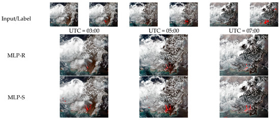 In the image at 03:00 UTC, there is minimal cloud cover in the southeast of the island; however, the difference between the smoke pixels and clouds is apparent. The MLP-R’s recognition ability in this image is poor. The other three MLP models successfully recognize the outline of smoke in the image. The two CTA models’ recognition results for this image are poor and the pixels near the smoke source are not recognized, on the contrary, many clouds are incorrectly interpreted as smoke.