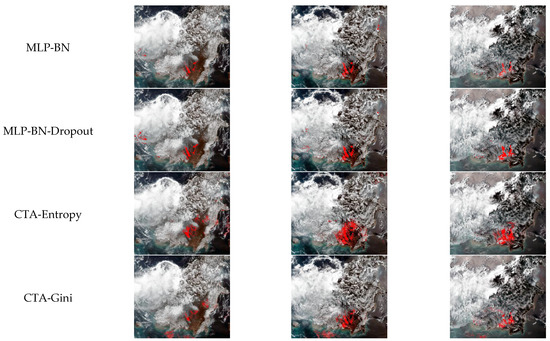 For the image at 07:00 UTC, the main smoke areas are blocked by clouds, and difficult to identify. The MLP based on the stratified samples still identifies smoke accurately, whereas MLP-R experiences difficulty in identifying smoke pixels. CTA-Entropy overestimates the smoke areas and selects some clouds. CTA-Gini does not recognize the clouds completely and mistakenly classifies them. The results of MLP-BN-Dropout are slightly better than MLP-BN and MLP-S because it can recognize more smoke without mistaking clouds. There is a small smoke area on the sea surface in the northeast region that all the models struggle to identify, because there are few samples at 07:00 UTC, and these methods cannot learn the spectral features of the smoke on the sea surface well. However, the MLP is based on the stratified samples, roughly identifying the smoke area in the northeast of the image at UTC 05:00, whereas the two CTA models cannot recognize smoke well.
