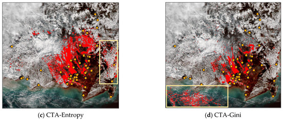 Figure 5 shows detailed recognition results of the main smoke areas at 05:00 from Figure 4. Figure 5 shows that MLP-BN-Dropout (b) can distinguish sparse smoke obscured by clouds (as shown in the green box), whereas CTA-Gini (d) mistakenly identifies the thin cloud on the sea as smoke. CTA-Entropy (c) mistakenly identifies the beach and some thin clouds on the coastline as smoke (as shown in the yellow box). As observed in Figure 5, the CTA entropy model is more sensitive to thin smoke, whereas MLP-BN-Dropout tends to identify pixels with high smoke concentration pixels.