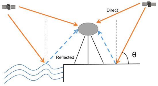 A geodetic-quality GNSS receiver is typically installed as shown in Figure 1. In the ground-based case, due to the reflections from the surrounding environment (sea surface, soil surface, etc.), superimposition at the antenna will produce a relatively stable interference signal, and the interference phenomenon is more obvious under the low elevation angle of the satellite. The interference signal SNR received by the antenna can be given by: