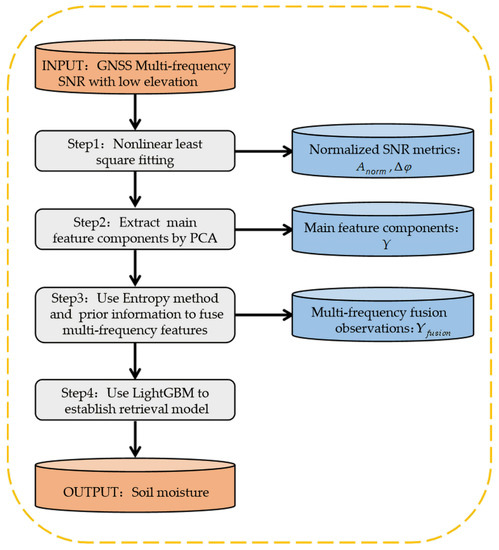 Specifically, the algorithm procedure is shown in Figure 2. The method proposed by Larson was used to calculate the phase offset and amplitude of SNR data within low elevation angles in the range 5°~25°. In order to reduce the complexity of data selection and extract the major feature components, Section 2.2.2. describes the use of principal component analysis (PCA) to cluster the phase offset and amplitude data of different tracks within a 15° sliding window of azimuths. More importantly, to make full use of the complementarity between different frequencies and improve inversion accuracy, the weights are calculated to fuse multi-frequency feature observations in Section 2.2.3. Then the data set is divided into the training set and test set at a ratio of 4:1. With the fusion feature observations based on the proposed method as an input and the ground soil moisture as an output, the retrieval model based on Light Gradient Boosting Machine (LightGBM) is established in Section 2.2.4. Eventually, this model is compared with the multi-satellite unary linear regression model and another model with single-frequency original phase offset series as input, based on LightGBM.