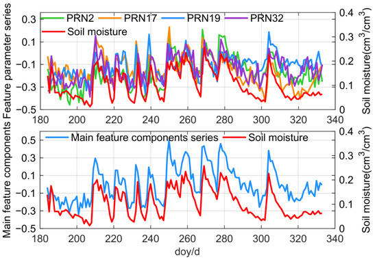 First, according to Section 2.2.2, PCA is adopted to cluster the tracks whose azimuths are within 15°. An example using station P043 is depicted in Figure 5. Due to the different transmitting power of GNSS satellites, the reflected signals recorded by the receiver are not the same. Therefore, the amplitudes and phase offsets calculated by Equation (2) have large differences for different satellites. As shown, for PRN32 and PRN17 (Figure 5, top), the correlation coefficient with the ground truth values is only 0.3723 and 0.6557, showing a large deviation, while after track clustering the correlation coefficient between the main feature components series (Figure 5, bottom) and in situ soil moisture is increased to 0.7887, which further extracts the main information of feature parameters.