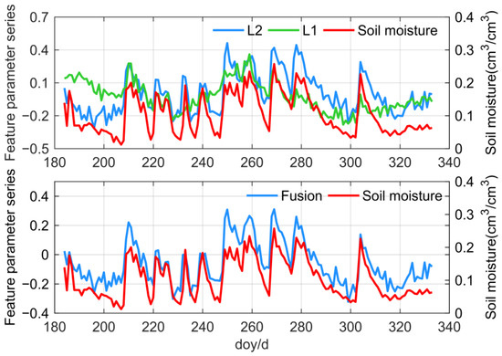 To take full advantage of the complementarity between different frequencies, the weights are calculated by Equations (7)–(16) to fuse multi-frequency feature observations. Figure 6 gives an example of fusion results using station P043. It should be noted that there are relatively large differences between the L1 and L2 frequency, for which the correlation coefficient is 0.3061 and 0.7887, respectively. The possible reason for this phenomenon is that the L1 SNR data are less precise than the L2 SNR data. Specifically, this is related to the new L2C code being more robust than the L1 C/A code and the different tracking power between the L1 and L2 signals [19], which means that the L2 SNR is more conducive to soil moisture retrieval. In contrast, the multi-frequency fusion results show a correlation coefficient of 0.8318 with respect to the ground truth soil moisture, 0.05 larger than the correlation only using the L2 frequency, thus showing that combining data from both frequencies allows a better soil moisture retrieval [27].