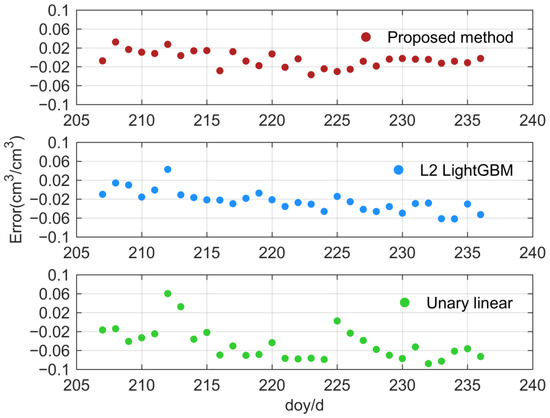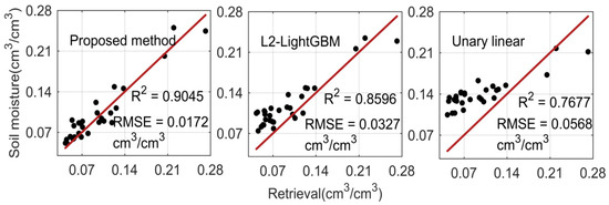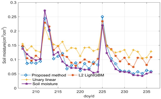 Figure 7 depicts an example of verification of soil moisture measurements using station P041. The ground truth soil moisture data from three depths (2.5, 7.5, and 20 cm) were collected by the University of Colorado [12], which can provide a daily average soil moisture. It can be seen from Figure 7 that all three methods can roughly reflect the changing provide a moderate accuracy with respect to the ground truth values, showing correlation coefficient of 0.9045, 0.8596, and 0.767, respectively. The retrieval values based on machine learning are in good agreement with the ground truth soil moisture, which fully proves the feasibility and accuracy of the soil moisture retrieval model using machine learning algorithms. However, both using LightGBM, the results of the proposed method are improved and fluctuation is smaller than another method using the L2 signal. Conversely, there is still a large deviation between the results of the linear regression model and ground truth values, especially during days of year (DOYs) 214–224 and 230–235.