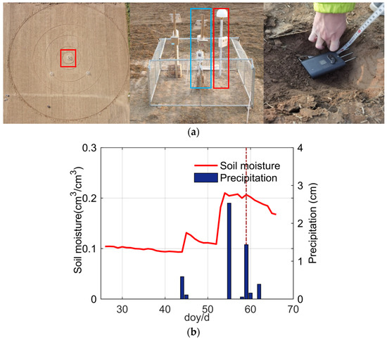 (a) Instrument and equipment (mid), surrounding environment (left), and soil moisture sensor (right). The red box represents the antenna and receiver; the blue box represents power supply equipment. (b) The soil moisture-rainfall diagram during the experimental period.