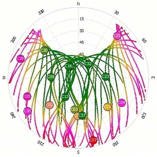 Note that the difference between the previous experiments was that BDS B1-2, B2b, and B3 signals (S2I, S6I, S7X) [39] were chosen to verify the applicability of soil moisture retrieval by BDS. Unlike the other three constellations, BDS consists of satellites in three types of orbits: the Geostationary Orbit (GEO), the Inclined Geosynchronous Orbit (IGSO), and the Medium Earth Orbit (MEO). The trajectories of BDS satellites of station Henan on DOY 30, 2021 are shown in Figure 9. The different trajectories show the different orbit types they belong to. The trajectories shaped like an ‘8’ represent IGSO, and the trajectories showing a point represent GEO. As there is almost no change in the elevation angle for GEO satellites, the SNR arcs from GEO satellites have no multipath oscillation, so the traditional method cannot be used for retrieval. Due to the characteristics of BDS mixed constellation and the different orbital parameters, the pre-processing of IGSO and MEO is slightly different. As shown in Table 2, the revisit periods of BDS satellites are much longer than those of GPS. MEO satellites need seven times the amount of GPS data, which puts forward certain requirements for the amount of data. In the case of short observation time, the average value is considered to be used. Specifically, MEO use the average phase offset and amplitude within 5° azimuths, while IGSO processes in the same way as GPS.