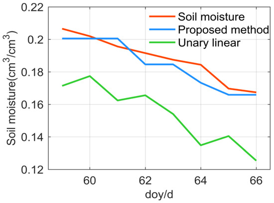 According to the method proposed above, the soil moisture can be calculated. Figure 10 depicts the retrieval results of the Henan experiment. These indicate that the estimation obtained from two methods agrees well with the in situ soil moisture, which proves that BDS has a similar potential to GPS in soil moisture retrieval. However, there is a significant deviation in unary linear regression model, with 0.03 , approximately. This further proves that the direct retrieval of soil moisture from single-satellite or single-frequency data involves relatively large uncertainties, which may be caused by the differences among the geometric motion trajectories relative to the satellites during the experiment and the performance of the satellites. On the contrary, the proposed one has better retrieval performance in the whole experiment period, which shows great correspondence with in situ soil moisture.