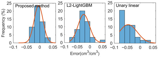 In the PBO H2O networks experiment, an example of the soil moisture retrieval errors produced by three methods with station P041 is illustrated in Figure 11. Obviously, most of the residuals based on LightGBM are concentrated within ±0.04 , while those from the traditional method are slightly larger, with a variation of ±0.06 . The errors of LightGBM, based on L2 frequency, are slightly worse than those of the proposed method, which have the highest accuracy, with stable residuals smaller than ±0.02 . A statistical histogram of the proportion of the absolute error for the soil moisture inversion obtained using three models is depicted in Figure 12. Furthermore, 83.33% retrieval residuals of the proposed method are distributed with ±0.02 . Only 16.67 and 53.33% retrieval residuals calculated by the traditional method and the L2-LightGBM method are distributed within these. By contrast, 46.67% retrieval residuals by the traditional method are larger than ±0.05 , with the proposed method being zero. Furthermore, the proposed method distributes more narrowly than the other two models and conforms to a normal distribution overall. Therefore, by fusing of multi-frequency SNR data, the problems of partial fluctuation and low retrieval accuracy can be effectively overcome.