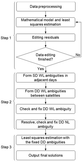 - The first step includes data preprocessing mathematical modelling, parameter estimation and residual editing. In data preprocessing, the data gaps and cycle-slips are detected based on the Turboedit algorithm [27]. Then, the code and carrier-phase observations are modelled with the IF combinations, and the parameters are estimated with the sequential least squares method to obtain the real-valued solution. It should be noted that we do not eliminate the ambiguity parameter as [7] did, because the number of parameters is not large for a single station.