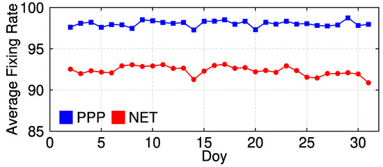 - The second step is on the ambiguity resolution. Firstly, the un-differenced estimates of wide-lane ambiguities are derived from HMW combinations. Then, for each satellite, search the corresponding WL ambiguity for the second sidereal day through the start and end epochs plus 2864, and form the SD WL ambiguity. Note that, even though the specific GPS satellite has slightly different repeat periods [28,29], observations with 30s sampling rate would not have to consider the specific repeat period. However, for the higher sampling rates, such as less than 10s, the exact repeat period needs to be considered for the specific satellite. Next, the DD ambiguity is formed between satellites and inserted to Equation (14) to check whether the ambiguity can be successfully resolved. If it is fixable, the un-differenced IF ambiguities are mapped as the WL ambiguities did to obtain DD IF ambiguity, and DD NL ambiguity is derived by the fixed WL ambiguity and the DD IF ambiguity as in Equation (16). Then, Equation (14) will be applied to fix the DD NL ambiguity.