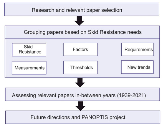 The authors aim to establish a critical understanding of skid resistance through several sections. The classification and methodologies used, and the grouping of papers into different topics, are outlined in the current section (see Figure 1).