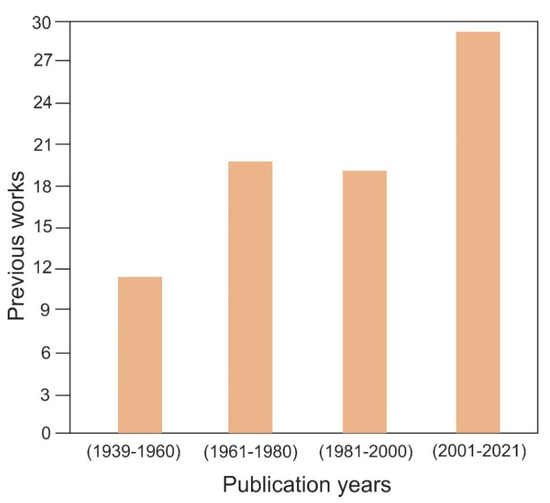 Figure 2. Number of previous research works included in this study versus publication years. - Key words are used to search for papers (skid resistance methodologies, skid resistance models, new trends in skid resistance, current challenges in skid resistance, factors affecting skid resistance, and road-based sensors) in different databases such as Scopus, Science direct and Web of Science in order to select relevant papers.