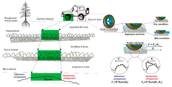 Theoretically, a complex interaction between tires and road pavements consists of two phenomena, such as molecular adhesion and hysteresis losses, and thus, the overall friction between the tire and the road surface is the sum of these two components [22,23]. Molecular adhesion is generated as a consequence of the shearing of molecular bonds (S) formed when the tire rubber is hard-pressed into a close contact area (Ai) with pavement surface particles (see Figure 4). Hysteresis losses are produced due to the energy dissipation of the deformed tire rubber when passing across the asperities of a rough pavement surface. The hysteresis losses relate to the energy that is stored (Ec) and dissipated (Ee) during tire–surface interaction for an acknowledged velocity (V) in that section. Thus, energy losses (C) happen during tire–surface interaction as the rubber is consecutively compressed and expanded. Generally, pavement surface adhesion friction decreases when the hysteresis losses increase [7,24,25]. These two components of skid resistance are related to the two key properties of road pavement surfaces: micro-texture and macro-texture (see Figure 4).