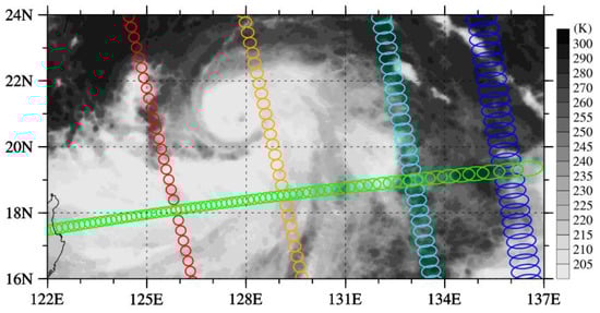 FY-3D MWTS-2 field of view (FOV) footprints with a 1.1° beam width along a single scan line (green ovals), as well as the 2nd (blue ovals), 9th (cyan ovals), 25th (orange ovals), and 45th (red ovals) in the along-track direction over a portion of the swath on 7 August 2019. The background image shows the FY-4A AGRI 10.7 µm channel observations at 0500 UTC on 7 August 2019. The center of Typhoon Lekima at this time was located at (127.9° E, 20.8° N).