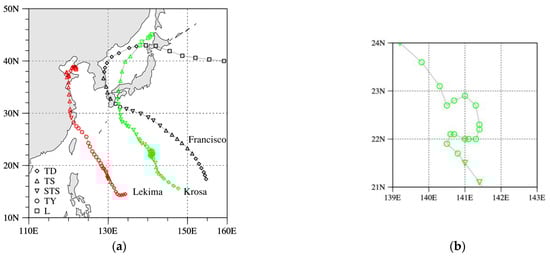 This study takes up three typhoons (Francisco, Lekima, and Krosa) in the monsoon trough during the 2019 season as case studies. Figure 1 shows their observed tracks based on the best track data from the Regional Specialized Meteorological Center in Tokyo. Lekima formed in a tropical cloud cluster east of the Philippine Sea as a tropical depression at 0600 UTC on 2 August 2019. It developed into a typhoon at about 1800 UTC on August 6. Lekima landed on Wenling City with a maximum sustained wind of 50 m s−1 (Figure 2c) at 0600 UTC on 8 August 2019, while causing severe rainstorms and disasters in Zhejiang, Jiangsu, and Shanghai provinces. Typhoon Krosa formed at 0000 UTC on August 5 and dissipated at 1200 UTC on 17 August 2019. Krosa was stagnant and rotated during the period from 0000 UTC on August 8 to 1800 UTC on 10 August 2019 (Figure 2b). The temporal evolutions of the radii of 30- and 64-kt (1 kt = 0.51 m s−1) winds from 2 August to 16 August are shown in Figure 2d, which indicates the typhoon’s size and intensity.