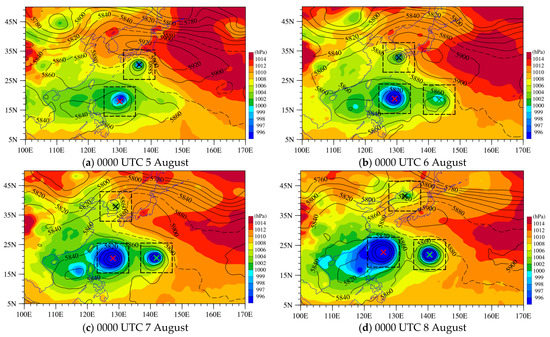 (a–d) The ERA-5 mean sea level pressure (color shading) and 500-hPa geopotential height (black curves) at 0000 UTC from 5 to 8 August 2019 for Typhoon Francisco (black cross), Lekima (red cross), and Krosa (green cross). The 10° × 10° boxes (black) of typhoon centers are depicted to show the regions where the temperature anomalies are calculated.