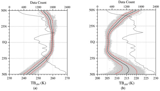 Scatterplots of latitudinal distributions of FY-3D MWTS-2 brightness temperature observations of (a) channel 4 and (b) channel 8 for all clear-sky nadir points over the ocean during the time from 10 to 31 July 2019 (gray dots). Also shown are the mean values (black curve) and mean ± one-standard deviation (red dashed curves) and data counts (black dotted curves) calculated at 2° latitudinal intervals.