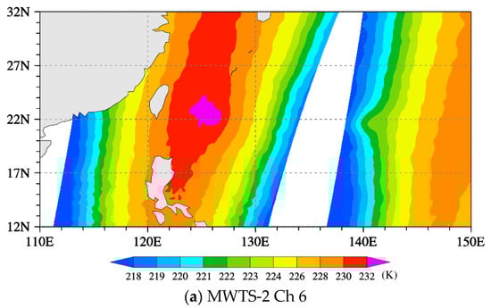 The Fengyun-3D satellite (FY-3D) was successfully launched into space on 14 November 2017. Its local equator crossing time (LECT) is 14:00 local time (LT), and is 0600 UTC at (120° E, 0). The FY-3E satellite has been launched in July 2021, with a LECT of 05:30 LT, and is 2130 UTC at (120° E, 0). FY-3E will be the first early-morning orbit in the FY-3 series [30]. Each POES provides global observations twice daily. After the launch of FY-3E, a combination of the FY-3D, FY-3E, the European series MetOp-B/C, and the NOAA series S-NPP and NOAA-20 can observe typhoons with relatively high temporal resolution (~12 times daily). Although the MWTS-2 onboard the FY-3D lacks 23.8 GHz and 31.4 GHz window channels for retrieving the cloud liquid water path (LWP) [31], the cloud detection scheme developed by Niu and Zou [32,33] can be applied. The cloud detection scheme is based on the MWTS-2 50.3 GHz bias-corrected observations-minus-backgrounds (O-B) and can effectively identify more than 97% of cloudy data points of MWTS-2. The two window channels at 23.8 GHz and 31.4 GHz are added to the MWTS-3 onboard the FY-3E. We point out that the cloud detection algorithm is crucial for the accurate retrieval of typhoon warm-cores from FY-3D MWTS-2 observations of brightness temperature (TB).