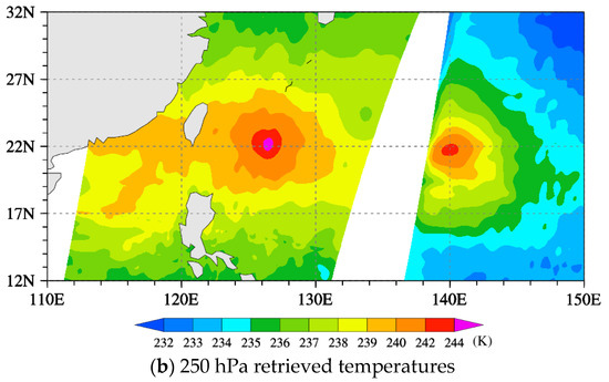 We examine the spatial distribution of the MWTS-2 channel 6 (WFP = 250 hPa) TB observations at descending nodes on 7 August 2019 (Figure 7a). The TB values at limb FOVs are smaller than those at nadir, which is the so-called limb effect. The limb effect is mainly due to longer atmospheric optical paths at larger scan angles, which result in higher weighting function peaks (above 250 hPa) of the limb FOVs for MWTS-2 channel 6. Therefore, the MWTS-2 temperature retrieval is carried out at different FOVs in consideration of the limb effect. The air temperature thus retrieved by the MWTS-2 at 250 hPa on the same day does not present any limb effect (Figure 7b). The warm anomalies are seen around the centers of typhoons Krosa and Lekima, whose centers were located at (140.2° E, 22.4° N) 1545 UTC and (126.5° E, 22.1° N) 1724 UTC on 7 August 2019, respectively. Figure 8 shows the vertical cross-sections of the temperature anomalies at 1724 UTC on 7 August 2019. Figure 8a shows an unrealistic cold anomaly in the lower troposphere, which is eliminated in the retrieval (Figure 8b) that removes cloudy data at MWTS-2 channels 3, 4 and 5.