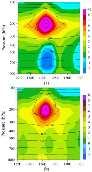 West-east cross-sections of temperature anomalies (shaded) and potential temperatures (contour) from FY-3D MWTS-2 (a) with and (b) without channels 3, 4 and 5, at 1724 UTC on 7 August 2019.