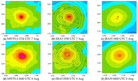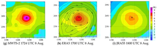 Although a typhoon bogus method was incorporated in the Japanese 55-year Reanalysis (JRA-55) isobaric analysis fields [35], its horizontal (1.25° × 1.25°) and temporal (0000, 0600, 1200, and 1800 UTC) resolutions are too coarse to resolve typhoon structures. Therefore, the ERA-5 reanalysis with much higher resolutions (0.25° × 0.25°, hourly) is also used for validating the typhoon’s warm-core structure in this study. Figure 9 compares the warm-core anomalies at 250 hPa between the FY-3D MWTS-2 retrieval and the ERA5 and the JRA-55 reanalysis for typhoons Lekima at three selected times during 7–8 August 2019. Although ERA5 and JRA-55 have comparable warm-core structures to MWTS-2, the peak temperature anomalies are too weak. It shows that the peak warm-core intensities obtained from the ERA5 and JRA-55 are about 2–3 K and 3–4 K lower than that retrieved by the MWTS-2, after subtracting the same environmental temperature. The environmental temperature is defined as the average temperature within two 15° × 15° boxes 1000 km away from the typhoon center on the west and east sides, which are 236.4 K, 236.5 K, and 236.5 K for Figure 9a,d,g, respectively. The horizontal resolutions of ERA5 and JRA-55, which are lower than that of MWTS-2 (~0.15° × 0.15°), can explain the underestimation of TC’s size and intensity [21]. The warm-core center obtained from the MWTS-2 (Figure 9d) is located to the west of that from the ERA5 (Figure 9e) around 0500 UTC on 8 August 2019. By comparing with the FY-4A AGRI observations in Figure 10a–c, the MWTS-2 warm-core center (black typhoon symbol) is closer to the AGRI observed typhoon eye of Lekima, which indicates a good reference to estimate the locations of typhoon centers.
