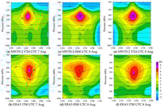 West-east cross-sections of temperature anomalies (shaded) and potential temperatures (contour) from FY-3D MWTS-2 (left panels) and ERA5 (right panels) passing the best track centers of Typhoon Lekima at the same times as Figure 9a,d,g. The black cross stands for the maximum values of the warm-core anomalies.