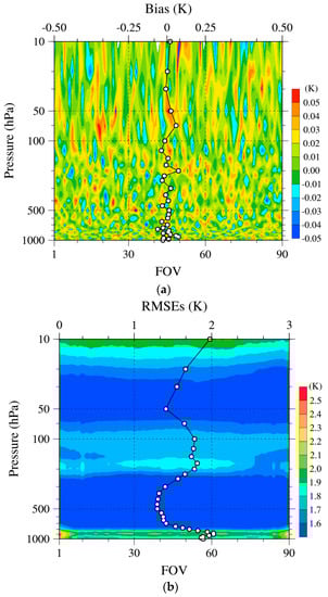 (a) Biases and (b) root-mean-square errors (RMSEs) of the temperatures between FY-3D MWTS-2 retrievals and the hourly ERA5 from 1 to 30 August 2019 at different FOVs. The vertical circles represent mean vertical biases and RMSEs in (a,b), respectively.