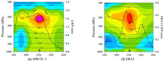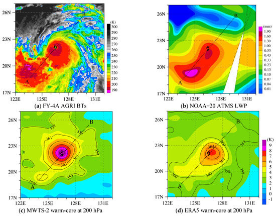 Figure 13a,b shows the FY-4A AGRI channel-12 TB observations and the LWP retrieved by the NOAA-20 ATMS [36] at 1700 UTC on 7 August 2019. The TB values in the inner-core region and the outer spiral rain band of Lekima are relatively low (Figure 13a), which are associated with high cloud tops, strong convection, and heavy precipitation (Figure 13b). The LWPs have two significant precipitation centers, one near the typhoon eye and the other near the location of 19.2° N, 124.5° E. The temperature anomalies and potential temperatures at 200 hPa obtained from the FY-3D MWTS-2 and the ERA5 reanalysis at this time are provided in Figure 13c,d, respectively. The temperature anomalies of the MWTS-2 and ERA5 are the strongest in the typhoon inner-core. There is a weak warm-core in the outer rain bands (19.2° N, 124.5° E). Figure 13e,f shows the cross-sections of temperature anomalies and potential temperatures from the FY-3D MWTS-2 retrieval and the ERA5 reanalysis along the AB line in Figure 13c,d. The points A and B are located at (18.5° N, 123.5° E) and (25.5° N, 129.5° E), respectively. There is a weak warm-core anomaly in the MWTS-2 (~5 K, Figure 13e) and the ERA5 (~5 K, Figure 13f) temperature distributions near 19.2° N at 225 hPa (Figure 13e) where the LWP values are large (black dashed line). Generally, there will be strong latent heat release when clouds form, which will result in a warm-core structure in the upper troposphere. There are also cold anomalies in the middle troposphere at 19.2° N in the air temperature obtained from both the MWTS-2 and ERA5, which could be associated with evaporation when rainfall occurred.