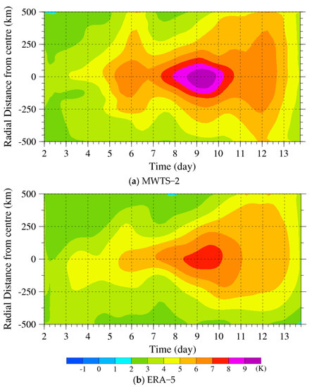 Temporal evolutions of the radial variation in (a) MWTS-2 retrieved temperature anomalies and (b) ERA5 temperature anomalies at 250 hPa within a 500-km radial distance along the west-east direction from the center of Typhoon Lekima from 2 to 14 August 2019.