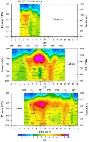 Temporal evolutions of the vertical variations in FY-3D MWTS-2 temperature anomalies (shaded) and potential temperatures (contour) at the typhoon centers of (a) Francisco, (b) Lekima, and (c) Krosa in August 2019. Also shown is the MSLP (black dot curve).